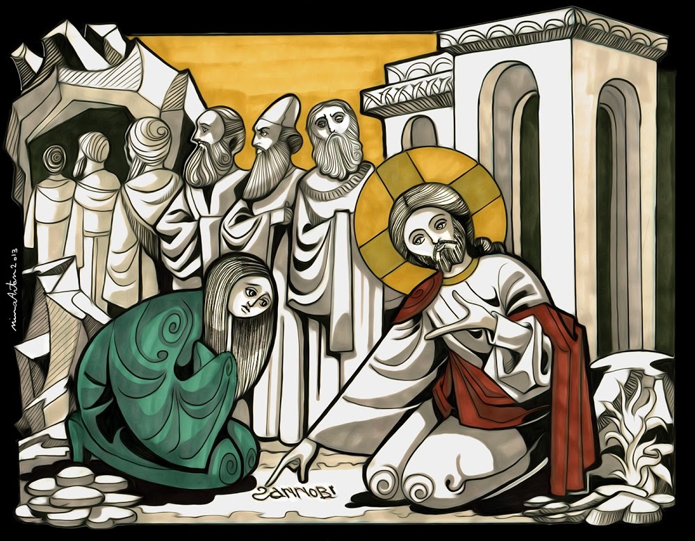 Comme ils persistaient à l'interroger, il se redressa et leur dit : « Que celui d'entre vous qui est sans péché lui jette le premier une pierre ! » Et se baissant de nouveau, il écrivait sur le sol. Mais eux, entendant cela, s'en allèrent un à un, à commencer par les plus vieux ; et il fut laissé seul, avec la femme toujours là au milieu.