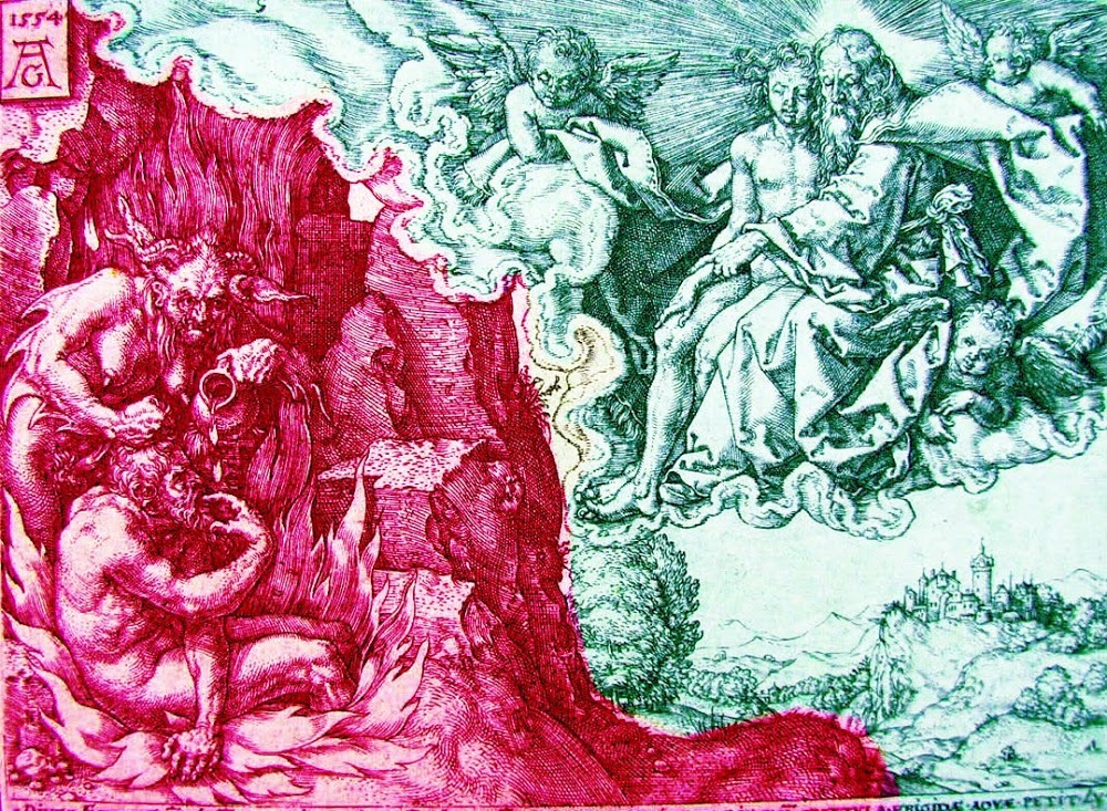 « Il y avait un homme riche qui se revêtait de pourpre et de lin fin et faisait chaque jour brillante chère. Et un pauvre, nommé Lazare, gisait près de son portail, tout couvert d'ulcères. Il aurait bien voulu se rassasier de ce qui tombait de la table du riche... Bien plus, les chiens eux-mêmes venaient lécher ses ulcères. Or il advint que le pauvre mourut et fut emporté par les anges dans le sein d'Abraham. Le riche aussi mourut, et on l'ensevelit. « Dans l'Hadès, en proie à des tortures, il lève les yeux et voit de loin Abraham, et Lazare en son sein. Alors il s'écria : «Père Abraham, aie pitié de moi et envoie Lazare tremper dans l'eau le bout de son doigt pour me rafraîchir la langue, car je suis tourmenté dans cette flamme. ».