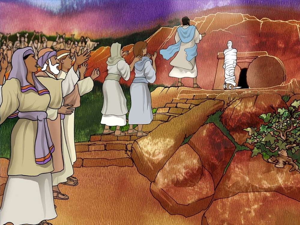 So Jesus, perturbed again, came to the tomb. It was a cave, and a stone lay across it. Jesus said, "Take away the stone." Martha, the dead man's sister, said to him, "Lord, by now there will be a stench; he has been dead for four days." Jesus said to her, "Did I not tell you that if you believe you will see the glory of God?" So they took away the stone. And Jesus raised his eyes and said, "Father, I thank you for hearing me. I know that you always hear me; but because of the crowd here I have said this, that they may believe that you sent me." And when he had said this, he cried out in a loud voice, "Lazarus, come out!" The dead man came out, tied hand and foot with burial bands, and his face was wrapped in a cloth. So Jesus said to them, "Untie him and let him go.".