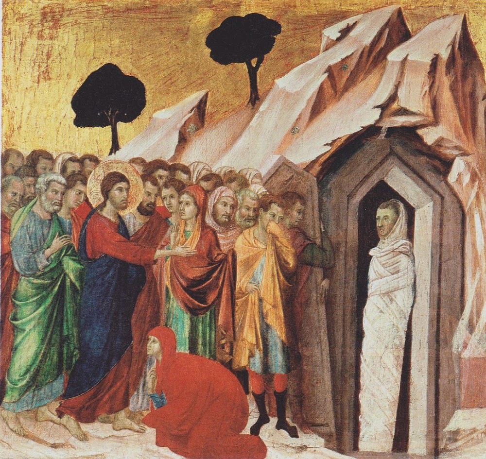 Alors Jésus, frémissant à nouveau en lui-même, se rend au tombeau. C'était une grotte, avec une pierre placée par-dessus. Jésus dit : « Enlevez la pierre ! » Marthe, la sœur du mort, lui dit : « Seigneur, il sent déjà : c'est le quatrième jour. » Jésus lui dit : « Ne t'ai-je pas dit que si tu crois, tu verras la gloire de Dieu ? ».